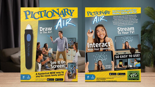 Еще одна интересная новинка с международного фестиваля игрушек Toy Fair 2019. Ручка Pictionary Air, которой можно рисовать в воздухе , а изображение появится на экране телевизора, планшета или другого устройства. Своими рисунками можно делиться с другими пользователями в социальных сетях или записывать видео рисунка человека. Но вообще ручка позиционируется как современное дополнение к играм, где надо молча объяснять слова. Например: Activity — невероятно весёлая игра, можно рисовать, говорить, махать руками, чтобы за минуту объяснить слова своей команде и победить...