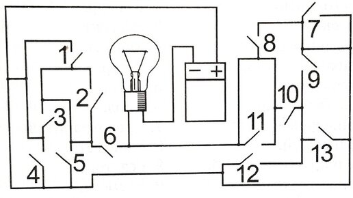 1. Назовите номер выключателя, с помощью которого можно включить лампочку от батарейки. 2. У Вас есть одна розетка на 220В, и 6 (шесть) удлинителей. Сколько электроприборов, можно подключить одновременно? 3. Возможно ли такое включение электроламп? (См...