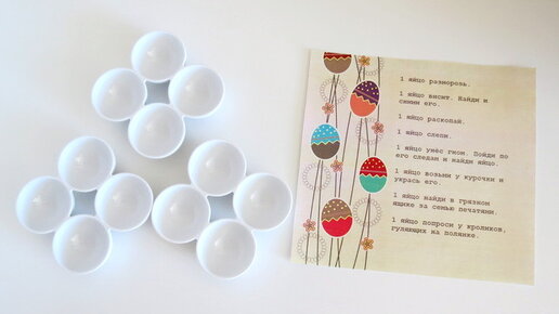 В европейских странах поисковая пасхальная игра (Easter egg hunt) очень популярна. Взрослые заранее прячут яркие яйца (настоящие крашеные или пластиковые, шоколадные и др.), а дети затем разыскивают их. Мы не религиозны, но Пасху празднуем. Я хотела сделать этот день весёлым для ребёнка. На ум мне сразу пришла охота на яйца. Однако я видоизменила игру: ребёнок искал не просто яйца, а конкретные яйца. Решила поделиться — может быть, кому-то пригодятся идеи на будущий год. В день Пасхи сын обнаружил на тумбочке мягкого зайца, лотки для яиц и лист с заданиями...