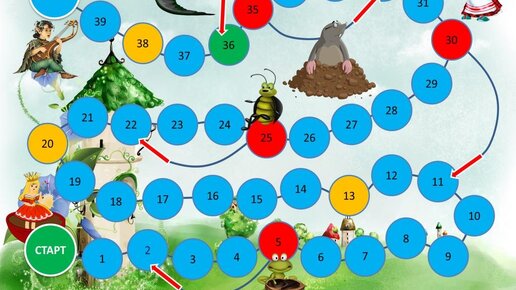 Для игры нужны – фишки, игральный кубик. Играющие в порядке очерёдности бросают кубик, и передвигают фишку по кружкам...