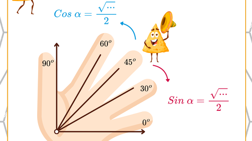 ✏️ На рисунке ладонь. Надеваем 💍 кольцо на палец-угол и находим: 🔹 sin угла = √(количество пальцев под кольцом) ÷ 2 🔹 cos угла = √(количество пальцев над кольцом) ÷ 2 📎 Бесплатно 🖼 PNG-версия — для печати и интерактивной доски...