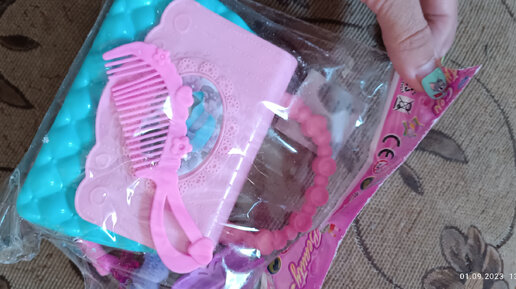 Всем привет! Всех с днем знаний! Родителям сил и терпения в новом учебном году! Сегодня на обзоре у нас очередной подарок из кукурузок Мика. В этот раз нам попался набор "модница". В него входит: сумочка, расческа, заколка и две резинки. А теперь рассмотрим подробнее. Сама сумочка сделана из пластика, как и расческа с заколкой. А вот резинки обычные, но на конце у каждой по бабочке на клею. Набор можно использовать для причёсок у кукол. Резиночки маленькие, на толстые волосы ребенка не думаю что влезут...
