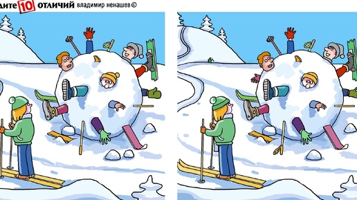 10 отличий и тест на внимание. Сегодня у нас катание на лыжах с горки. Сюжет загадки юмористический.