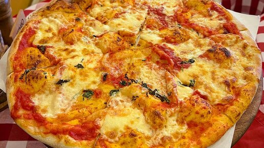 Пицца Маргарита по 380 ₽ из меню траттории Papa Carlo. Эта пиццерия — первый кандидат в «Битве пицц» и безусловный лидер в ваших рекомендациях. В составе: фирменный соус, сыр моцарелла, зелень. Вес 400 г. Размер 30 см. Пиццу приносят буквально минут через 10. Подаётся она на деревянной подложке с ножкой. Своего рода постамент для пиццы. Пицца на очень тонком тесте, но при этом не выглядит как фокачча. Томатная паста хороша, сыр тянется...