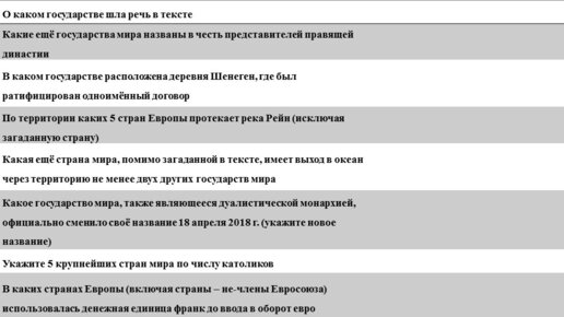 Почему бы не начать 2023 год с хорошей разминки для мозгов? Перед вами текст, посвящённый одной из стран Европы. Задания, связанные с текстом, представлены в таблице. Ответы - в первом комментарии к записи. Такие задания использую в учебном процессе для лучшего запоминания нескольких тем. Позволяет учащимся понять взаимосвязь между физической, экономической и политической составляющими стран мира. "Это одно из немногих государств мира, названное в честь правящей здесь династии. Государство не входит в состав ни Европейского союза, ни НАТО, но является участником Шенегнского соглашения...