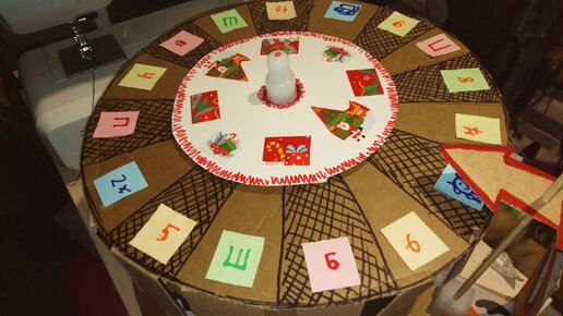 В преддверии Нового года моя дочь, как всегда, меня спросила: "А что будет на Новый год?". И я ей ответила: "Если сама себя не развлечешь, то ничего интересного может и не произойти." Вот это и послужило толчком для изготовления барабана к игре "Поле чудес", которую мы делали из бросового материала. Не судите строго, делали вместе с ребенком для семейного праздника. Для конструктива игры главное было: чтобы барабан крутился, была стрелка указывающая на значение. Для себя я ещё наметила пару задач: 1) сложение чисел, 2) закрепление названий букв и составление слов из букв...