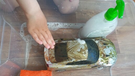 Мытье машин в ванной уже надоело, решили поиграть в ту же игру, но на полу. Знаю, знаю - убирать все эти развлекушки маме совсем не хочется... Из минусов - пришлось помыть полы, из плюсов - ребёнку было весело, мама лучший друг, был занят 45 минут, полы чистые)! У нас уже пару дней лежала дома машинка, которая была вся разукрашена акварельными красками (играли в покраску машин). Вот её мы и решили помыть для начала.. Сюжетно-ролевая игра: Машинка (мама): я была на гонке и ооочень испачкалась,...