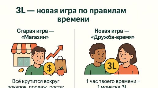 🌟 Объяснение 3L для ребёнка: новая игра про время и дружбу Привет! Ты знаешь, как устроен мир взрослых? У них есть две разные «игры». Давай я расскажу про новую — она называется 3L и основана не на деньгах, а на времени и помощи 🤝 🎮 Две игры в одном мире 1️⃣ Старая игра: «Магазин» Взрослые всё время что-то покупают и продают: яблоки, игрушки, машины цены всё растут деньги можно напечатать, как фантики из-за этого часто ссорятся и переживают 2️⃣ Новая игра: «Дружба + Время» (3L) В этой...
