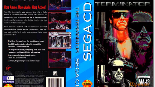 The Terminator - жанр Action, разработчик Virgin Interactive, 1993 год, система Sega CD - это игра больше, чем просто пересказ фильма Джеймса Кэмерона 1984 года, она также погружает в войну, происходящую за 40 лет в будущем. Вы играете за Кайла Риза, героя фильма и отца знаменитого Джона Коннора. Он был послан назад, чтобы защитить мать Джона и победить большого, злого робота, который ужасно похож на Арнольда Шварценеггера(ну естественно,а на кого же еще, было бы очень странно если бы там появилась чья та другая физиономия)...