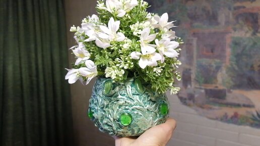 Приветствую вас на канале. У меня большая коллекция стеклянных камушков и очень хочется ими что нибудь задекорировать, поэтому появилась такая идея. Понадобится чулок. Беру часть выше стопы, завязываю узел и отрезанию все лишнее. В 1 кг клея для кафеля добавляю 200 мл воды (можно использовать цемент с песком или гипс). В центр помещаю баночку из под кукурузы и придаю форму. Оставляю сушится на сутки. Окрашиваю лаком для ногтей, забегая вперед скажу, что Учтите, что камушки вы приклееваете к белой шпатлевки, и соответственно белый цвет видет через стеклышки...