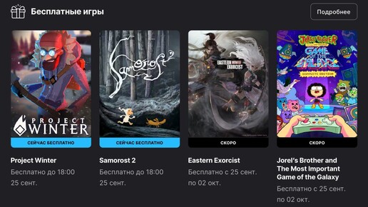 Epic Games Store запустил новую бесплатную раздачу, которая продлится до 25 сентября. Все пользователи могут бесплатно забрать две интересные игры. 🎁 Первая игра — «Project Winter». Это многопользовательская игра для 8 игроков, основанная на социальной маскировке и выживании. В игре есть русский язык интерфейса, а её рейтинг в Steam составляет 86% на основе 2 453 положительных обзоров. 🎮⚡ Вторая игра — «Samorost 2»...