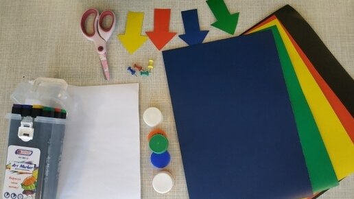 Цель: развивать зрительный ориентир, концентрацию внимания, закреплять основные цвета, воспитывать усидчивость. Материал: белый, цветной картон, ножницы, кнопки, цветные крышки от пластиковых бутылок, фломастеры, клей ПВА. Для начала нужно взять черный картон 1 лист, приклеить на расстоянии 5 см крышки разных цветов: красный, синий, зеленый, желтый...