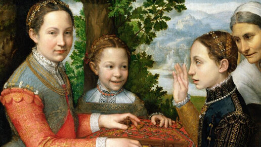 Итальянской художнице Софонисбе Ангиссола (1532-1625) было 23 года, когда в 1555 году она написала "Игру в шахматы". Ангиссола изобразила на картине свою родню, тем самым впустив зрителей в интимный мир своей семьи. Как женщине-художнице ей приходилось черпать вдохновение в людях из своей повседневной жизни, так как доступа к моделям-мужчинам у неё не было. В шахматной партии она изобразила трех своих сестер, Люсию (слева), Европу (посередине) и Минерву (справа), играющих в шахматы под присмотром гувернантки...