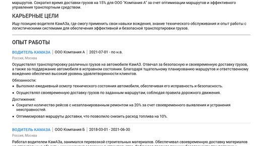 Изучение готового примера резюме водителя КамАЗа — лучший способ быстро составить свой документ. Получите эффективное резюме, которое поможет вам устроиться на работу. На нашей странице вы найдете готовые примеры для разных ситуаций, а также пошаговые инструкции по каждому разделу. Изучив пример, вы сможете создать резюме с помощью нашего конструктора резюме и адаптировать его под конкретные вакансии, будь вы начинающий или опытный специалист 🚛. Заголовок резюме – это первое, что видит работодатель...