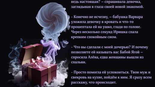 Начало Дома Алёна попыталась забрать дочь у незнакомой бабушки, но малышка ни в какую не хотела расставаться с бабушкой Варварой, которую почему-то называла Бабой Ягой. - Алёна, я понимаю. Как тебе сейчас тяжело. Но поверь мне, я вам желаю только добра. – тихо заговорила бабушка Варвара. – Разреши мне побыть с твоей дочерью. Я помогу ей помыться, поужинать и уложу спать. – Голос пожилой женщины звучал убедительно и успокаивающе, будто обволакивая тёплым одеялом. Алёна согласилась, но пошла вместе с ними...