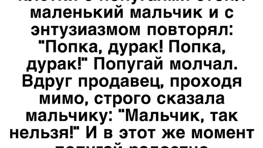 1. Случай в зоомагазине Зашел в зоомагазин за кормом для кота. Возле клетки с попугаями стоял маленький мальчик и с энтузиазмом повторял: "Попка, дурак! Попка, дурак!" Попугай молчал. Вдруг продавец, проходя мимо, строго сказала мальчику: "Мальчик, так нельзя!" И в этот же момент попугай радостно прокаркал: "Мальчик, так нельзя!" Мальчик ошалел и убежал к родителям. 2. Битва с техникой Моя бабушка, осваивая видеозвонки, позвонила мне через мессенджер. Я видел только ее лоб и люстру. "Бабушка, опусти телефон немного, я тебя не вижу!" — попросил я...