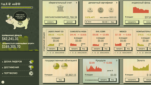 Сделал небольшую подборку онлайн-игр связанных с инвестициями, которые мне показались интересными. Главная их особенность - не нужно тратить много времени на прохождение. Всего несколько минут на каждую. Обгони индекс S&P500 Как вы думаете, сможете ли вы победить рынок? Можете проверить свои силы на простой онлайн-игре. Весь процесс занимает всего одну минуту. Правила игры: Попробуйте сыграть раз десять, чтобы собрать свою статистику. Думаю результат на длинной серии игр довольно предсказуемый Build Your Stax - жизнь инвестора Игра представляет симулятор жизни инвестора...