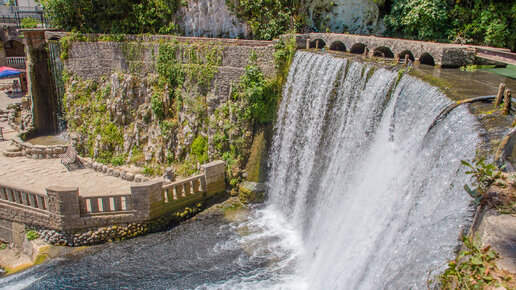 Всё это находится в одном месте - в абхазском городе Новый Афон. На фото ниже как раз и показан рукотворный водопад. На самом деле это обычный водосброс с плотины. Вроде ничего удивительного, скажите вы, ведь таких плотин-водопадов много. Но уникальность этого водопада в том, что создан он был в 19 веке – в 1882 году. Вид сбоку. С это стороны летом выстраивается очередь из желающих сделать фото на краю водопада. На втором фото вы увидите акведук, идущий от плотины Создан водопад был благодаря монахам, прибывшим в эти края из русского монастыря Святого Пантелеймона на греческой горе Афон...
