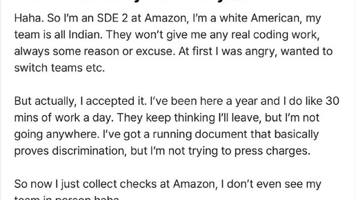🤔 "ИГРА В ИНДУСА": КТО КОГО ПЕРЕСИДИТ? Представь: ты попал в команду, где тебе не дают задач, но продолжают платить 16 тысяч долларов в месяц. Скучно? Возможно. Но наш герой, разработчик из Amazon, решил не сдаваться и превратил эту ситуацию в мастер-класс по прокрастинации. Почему это важно? Это пример того, как неправильная тактика может обернуться в пользу того, кого хотели "выдавить". Индусы рассчитывали, что скука заставит его уволиться, но он переиграл их...