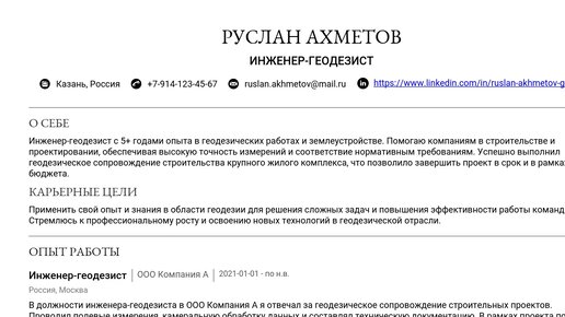 Пример резюме инженер-геодезиста — ваш ключ к созданию эффективного документа. Изучение готовых примеров поможет быстро составить сильное резюме, которое выделит вас среди кандидатов и приблизит к получению работы. 🗺️ На этой странице мы собрали готовые примеры резюме инженер-геодезиста как для начинающих, так и для опытных специалистов. Вы найдете пошаговые инструкции по созданию каждого раздела, учитывающие: Изучив пример, вы сможете создать свое идеальное резюме с помощью нашего конструктора резюме...