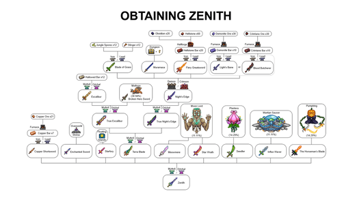 Зенит- это самый сильный меч в игре, был добавлен в обновлении 1.4.0.1(Крафтится после убийств: Стена Плоти, Лунного Лорда,) (а также нужно чтобы у вас были руды в мире: Медная руда или Оловянная руда, Железная руда или Свинцовая руда, Серебряная руда или Вольфрамовая руда, Золотая руда или Платиновая руда, Демонитовая руда или Кримтановая руда, Кобальтовая руда или Палладиевая руда, Мифриловая руда или Орихалковая руда, Адамантитовая руда или Титановая руда. Медный короткий меч 1 (выдается вначале игры, или же крафтится на железной или же свинцовой наковальне 5 слитков меди 1.4.1 с 7 на 5 уменьшено...
