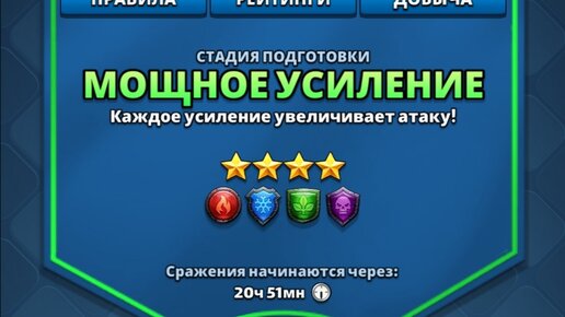 ⚔️ Турнир 21.12.2020 Друзья, всех приветствую этим отличный воскресным деньком. У нас снова объявлен турнир, и на этот раз это снова «Мощное усиление», но теперь на четвёрках и без жёлтых. Так что в центре будут танковать мощные фиолетовые герои. Давайте попробуем расставить команду мечты для этого турнира. Несомненным фаворитом в центр будет 🟣 Ригард в костюме. Это вообще топ для этого турнира. Без вариантов. Если нет костюма для Ригарда, то вместо него лучше поставить 🟣 Киприота, но только если он на большем числе эмблем, чем Ригард...