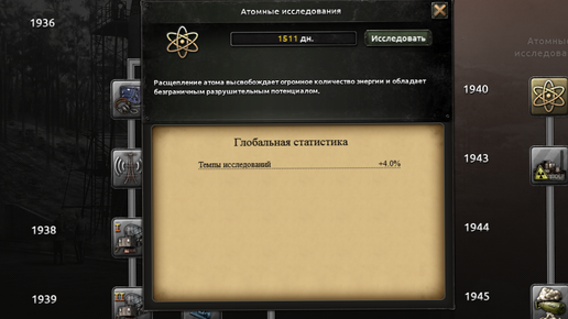 Изучение технологий атомных в хойке это долгий процесс, и почти у всех (особенно в мультиплеере) игроков, игра оканчивается примерно в 1942-1944, потому что дальше игра начинает сильно лагать, да и эффект от этого "ядерного оружия" очень печален.Сейчас выясним почему. Первая технология на пути к атомному оружию ничем не примечательна, а изучить ее можно только ближе к 40 году.Изучается она примерно 350 дней, это если без бонусов.Но есть фокусы и решения, с которыми можно ускорить создание атомного оружия о которых будет написано ниже...