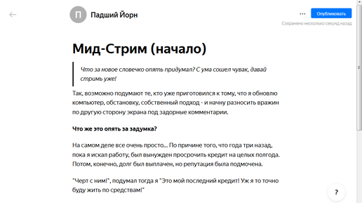 Что за новое словечко опять придумал? С ума сошел чувак, давай стримь уже! Так, возможно подумают те, кто уже приготовился к тому, что я обновлю компьютер, обстановку, собственный подход - и начну разносить вражин по другую сторону экрана под задорные комментарии. Что же это опять за задумка? На самом деле все очень просто... По причине того, что года три назад, пока я искал работу, был вынужден просрочить кредит на целых полгода. Потом, конечно, долг был выплачен, но репутация была подмочена. "Черт...