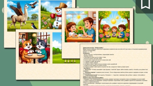 Дидактическая игра "Найди ошибку на картинке". Для занятий логопедов, дефектологов, психологов, воспитателей и родителей с детьми дошкольного возраста. Цель: Развитие речи, внимания, логического мышления и аналитических способностей через поиск и объяснение преднамеренных ошибок в изображениях. Материалы: набор 8 карточек с изображениями, содержащими ошибки. Ценность игры для развития ребёнка 1. Внимание: учит концентрироваться на деталях, развивает зрительное восприятие (поиск неочевидных несоответствий)...