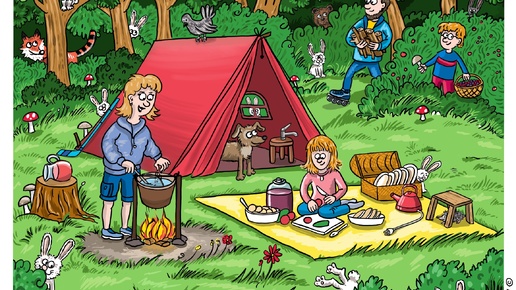 Хорошо на природе в горах! Птички поют, воздух свежий, всюду красота электричества правда нет, но зато отдых от цивилизации! Пока семья собирается обедать, можно поискать на картинке 8 ошибок (или лишних вещей) а так же отыскать всех зайцев...