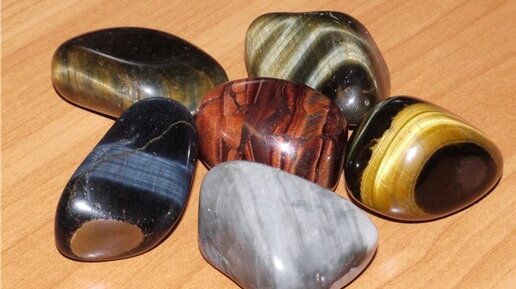 Данные камни - разновидности кварца с внутренней иризацией, имеющие характерный шелковистый отлив. Тигровый глаз в золотистого - коричневых тонах, соколиный глаз - иссиня - чёрный, кошачий - бывает серых, голубоватых, зеленоватых тонов, а бычий глаз - это тот же тигровый, но изменивший оттенок на буро - вишнёвый. У всех этих камней есть отличительная особенность - из-за структуры камня, свет, преломляясь, образует шелковистые полосы, они особо заметны при повороте камня. Оттого и названы глазами...