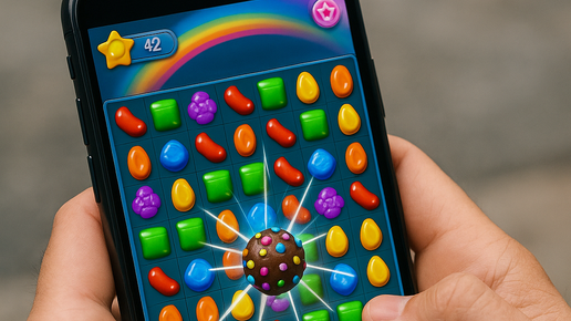 Candy Crush Saga — популярная мобильная игра жанра «три в ряд», разработанная компанией King. Она вышла в апреле 2012 года: сначала как приложение в соцсетях, а затем на смартфонах (iOS, Android). Игровой процесс на первый взгляд прост: нужно менять местами разноцветные конфеты, составляя цепочки из трех и более одинаковых, чтобы удалить их с поля и выполнить цель уровня. Если попытка провалилась, игрок теряет одну жизнь (из пяти доступных); жизни со временем восстанавливаются, или их можно получить от друзей либо купить за реальные деньги...