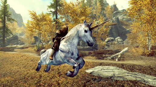Ездовые животные Довакина. …В библиотеке Коллегии магов Винтерхолда Довакин заметил лежащий на столе дневник Сорана. Ворчливый Ураг ничего не сказал, когда он потянулся к книжице в кожаной обложке; и герой, осмелев, взял её в руки и принялся читать: Единорог… Об этих существах из мифов понаслышке было известно лишь то, что они очень легко и безбоязненно идут на контакт только с прекрасной половиной человечества. Красивая, а самое главное – непорочная молодая дева, желательно обнажённая, едва появившись в лесу и запев, моментально привлекает великолепного зверя...