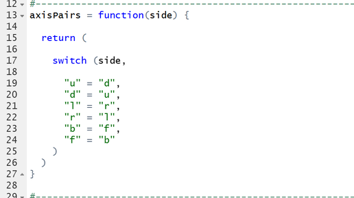 Поскольку мы уже решили, что сначала мы найдём на обоих кубиках единицу ("1") и проверим, что на противоположных гранях находится одно и то же число, нам необходимо уметь определять грань, противоположную данной. Если мы мы писали на Python или JavaScript, мы бы использовали словари (список пар "ключ - значение"). В Python словарь (dict) чрезвычайно удобный и функциональный, а в JavaScript это вообще основной тип данных (объект = словарь). Но в R нет словарей, хотя список (list) может произвести обманчивое впечатление, будто может работать как словарь...