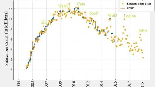Основываясь на данных Google Trends пользователь Reddit, под ником Arkey провел расчет активных подписчиков WoW. Основываясь с количеством запросов по тем или иным ключевым словам связанным с World of Warcraft он сопоставил данные прошлых лет с данными которые предоставляли сами Blizzard и по аналогии он продолжил график далее, когда уже Blizzard перестали публиковать подобные данные. Опираясь на этот график можно предположить, что на старте Legion в игре было более 10 миллионов активных игроков, которое затем сократилось до 4 миллионов...