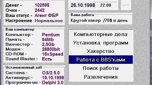 Все мы когда-то с чего то начинали... Сильная ностальгия. Это была одна из первых игр на моем компьютере, которая была уже не "детской". По сути игра представляет собой симулятор жизни компьютерщика 90-ых на пути к крутому хакеру. Игра сделана по подобию популярной тогда игры Fido. Это текстовая игра, в которой для совершения действий необходимо просто переходить по нужным пунктам. Игра была написана в 1998 году Игорем Кокаревым на Turbo Pascal для Win 95. Несмотря на это - играбельна до сих пор и почти не возникает проблем при игре...