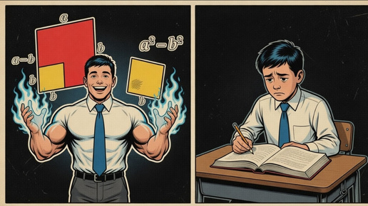 Сегодня мы не будем скучно раскрывать скобки и писать «по формуле». Мы возьмём большой квадрат, отрежем от него кусочек поменьше… и вдруг — бац! — поймём, почему a^2 - b^2 = (a - b)(a + b) ...