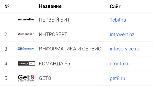 Рейтинг CRM-интеграторов в своей механике максимально прост, что позволяет получить результаты, отвечающие реальности на рынке. Места в рейтинге компаний, которые внедряют CRM, распределяются исходя из числа голосов за нее. В голосовании участвуют сами интеграторы, они же и определяют позиции своих коллег по рынку. В рейтинге также учитывались дополнительные критерии и коэффициенты (рейтинги партнеров CRM-систем, опрос в формате тайного покупателя, кейсы внедрения и т...