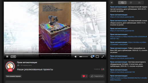 Перезапустил бесконечный стрим из наших роликов на площадке VK Видео LIVE. Обычно такие вещи делают на компьютерах с Windows + OBS + VLC. Наш стрим работает на виртуальном VDS-сервере + Python + FFMPEG. Т.к. стримом управляет Python, то я знаю какой конкретно ролик в данный момент воспроизводится, и с помощью API для разработчиков сообщаю в чат название ролика и ссылку...