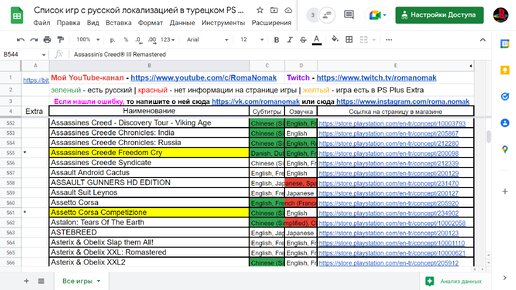 Если Вам интересно узнать какие игры в турецком Playstation Store имеют русский язык, то Вы можете посмотреть таблицу, где все это указано. Список игр с русской локализацией в турецком PS Store можно посмотреть здесь - https://bit.ly/3OmvKM4 Зеленый цвет в соответствующей колонке обозначает, что игра имеет русский текст или озвучку. Красный, что языки не указаны на странице с игрой. Если заголовок игры имеет желтую заливку, значит она присутствует в каталоге PS Plus Extra. Также у кажой игры есть...