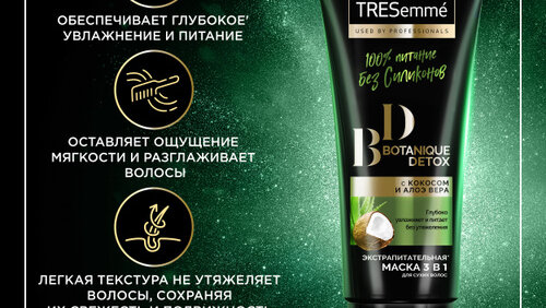 Надеюсь, все уже понимают, что "дорого" не всегда означает "качественно и полезно", как и "дешево" не всегда пустышка. В этой подборке собраны действительно рабочие средства для волос. И работают они за счет своего сбалансированного состава. Классные, БЮДЖЕТНЫЕ МАСКИ на любой вкус и тип волос. TRESemmé Botanique detox Маска для волос, питательная, с кокосом и алоэ вера TRESemmé крутой бренд, достаточно бюджетный, который прекрасно зарекомендовал себя на рынке. Лично мне нравятся их кондиционеры, иногда использую в технике "пре-пу"...