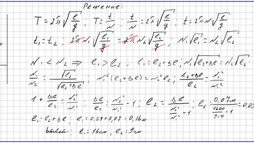 Математический маятник. Задача №1. Два математических маятника за одно и то же время совершают первый N1 = 30, а второй N2 = 40 колебаний. Какова длина каждого из них, если разность их длин Δl = 7 см...