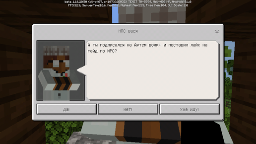 Всем привет! Человек попросил в комментариях сделать вот такой небольшой гайд, поэтому я решил его сделать. Тут мы поговорим на две темы, мирные и агрессивные NPC. Т.е какие бывают мирные, а какие агрессивные. Никакие их передвижения, сцены и т.д я не буду писать, ибо сам не знаю. Приступим. Как сделать мирного NPC? Во первых, нажмите специальной мотыгой по любому блоку, тем самым вы создадите мирный шаблон, который умеет лишь приветствовать вас. Но как дать ему какую нибудь роль, что бы он продавал, давал квесты или что то такое? Грубо говоря - пацифист...