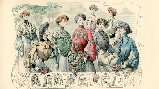 В начале XX века темпы жизни ускорились, и мода менялась куда быстрее, чем раньше. Это касалось и силуэта в целом, и шляпок, и отделки... И рукавов! Взгляните, что предлагал один и тот же журнал в 1901 и 1905 - рукава пышные в районе запястья, и рукава, пышные в районе плеча. Совсем разные силуэты, а прошло-то всего несколько лет! Конечно, всё случилось не сразу, и в промежутке рукава ещё успели побыть равномерно пышными по всей длине. Но всё равно - быстро, быстро тренды сменяют друг друга... Так...