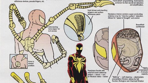 Дизайн оригинального Железного Паука от писателя Джея Майкла Стражински и художника Рона Гарни был максимально плох: цветовая палитра Железного Человека в костюме Человека-Паука, невнятная передняя паучья эмблема, напоминающая скорее узор осы, такие же невнятные "браслеты" на запястьях рук и на голенях - костюм смотрелся максимально невразумительно и смотрится таковым до сих пор. И это не говоря о наличии лишь трёх механических паучьих лап. Художнику Инсомниак Энрике Насполини и его коллегам выпала...