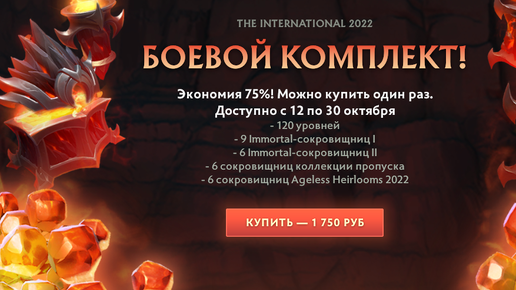 В ночь с 12 на 13 октября студия Valve порадовала любителей Dota 2 и выпустила первый бандл для Battle Pass, приуроченный к The International 2022. В него вошло 27 различных сокровищниц и 120 уровней. Стоит отметить, что такое предложение на 75% выгоднее, чем напрямую покупка уровней. Боевой комплект будет доступен с 12 по 30 октября, его можно приобрести только один раз, а стоимость достигает 1 750 рублей...