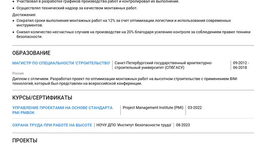 Найти работу мечты поможет правильно составленное резюме. Изучите наш готовый пример резюме монтажника ПВХ-конструкций, чтобы понять, как представить себя наилучшим образом и получить приглашение на собеседование. В этом материале вы найдете пошаговые инструкции по составлению каждого раздела резюме, подкрепленные готовыми примерами: Это подробное руководство поможет составить эффективное резюме как начинающим специалистам, так и опытным монтажникам ПВХ-конструкций. Изучив пример, вы сможете создать резюме с помощью нашего конструктора резюме...