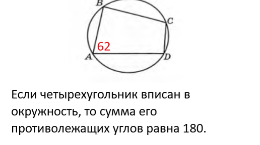 Угол А четырёхугольника ABCD, вписанного в окружность, равен 62°. Найдите угол С этого четырёхугольника. Ответ дайте в градусах.