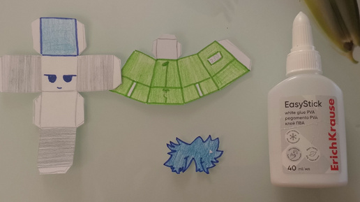 Всем привет. Сегодня я буду делать персонажа из игры «В кальмара». Нам понадобится клей и шаблоны (можно распечатать или нарисовать). Берём голову и сгибаем по линиям. Теперь склеиваем. Приклеиваем волосы...