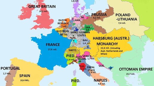 На карте показана численность населения европейских стран в 1780-е годы, накануне Французской революции и последних разделов Польши...